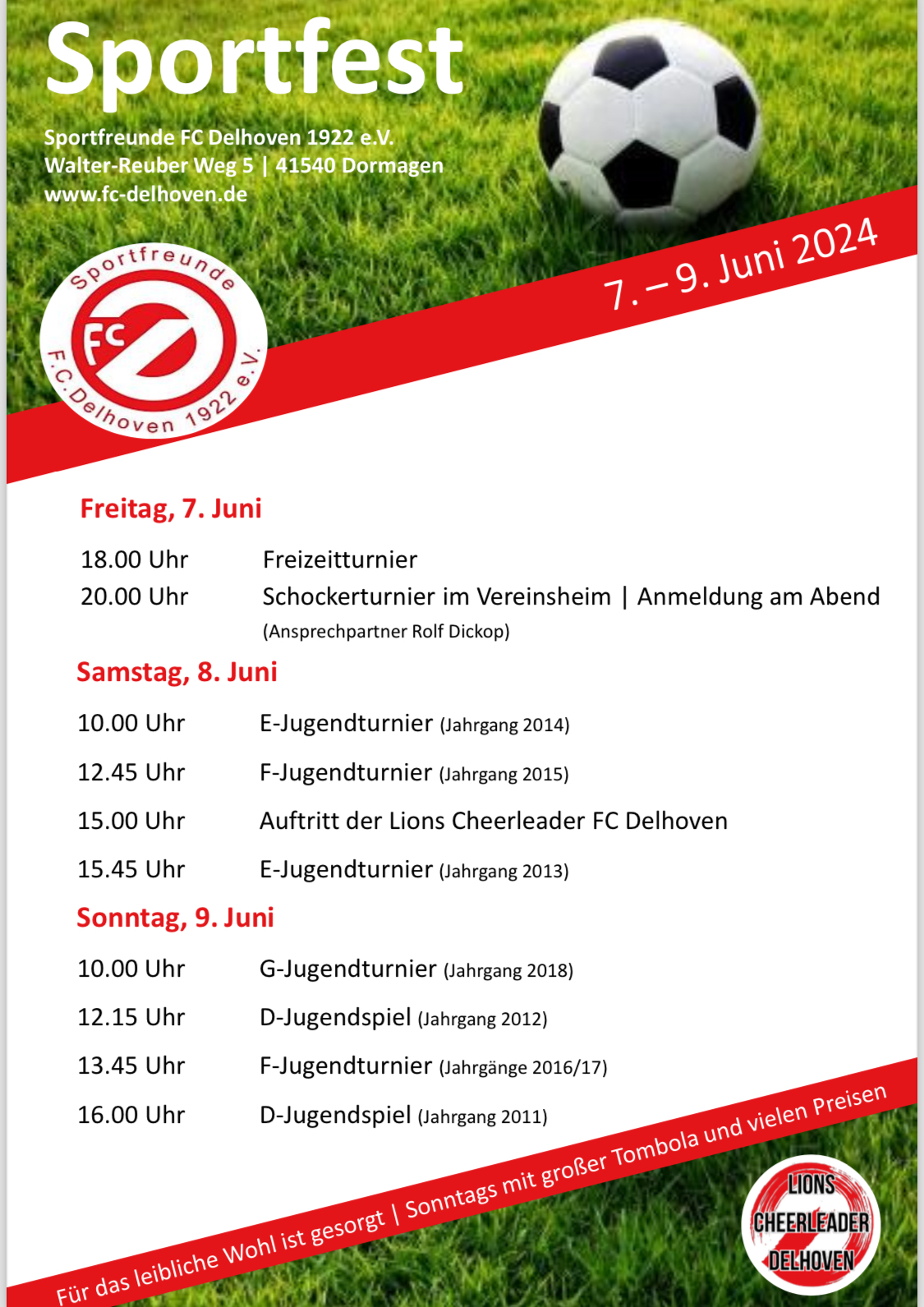 Unser Sportfest findet in diesem Jahr vom 07. bis zum 09. Juni statt. Es wird zahlreiche Jugendturniere und eine große Tombola geben. Starten werden wir am Freitag mit einem Freizeitturnier….